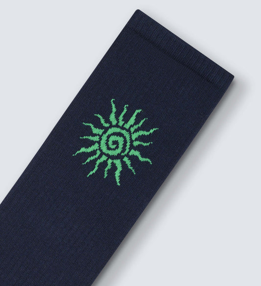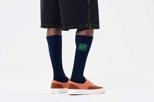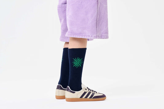 Ispirate ai surfisti che cercano calore e comfort dopo un'intera giornata trascorsa a cavalcare le onde, abbiamo voluto creare le calze perfette per il dopo-surf. Realizzate in morbido e traspirante cotone, queste calze arrivano fino al ginocchio e tengono al caldo i polpacci umidi dei surfisti. La stampa del sole trasmette un'atmosfera hippie anni '90.