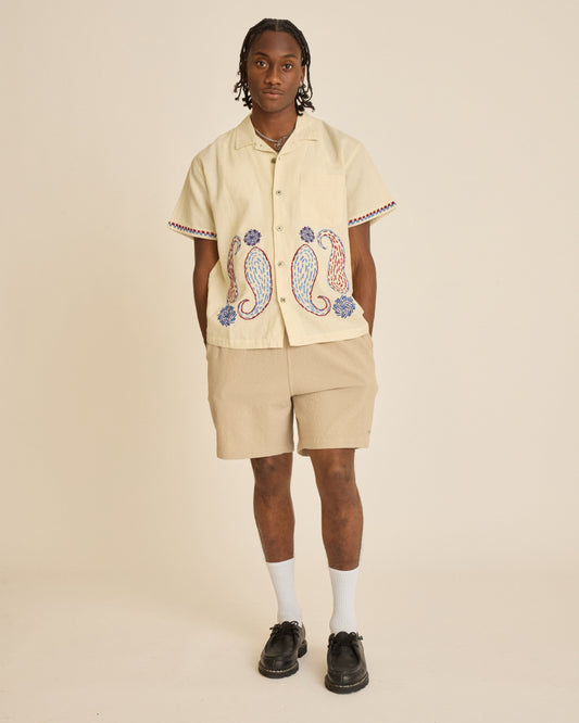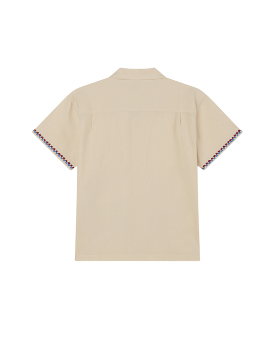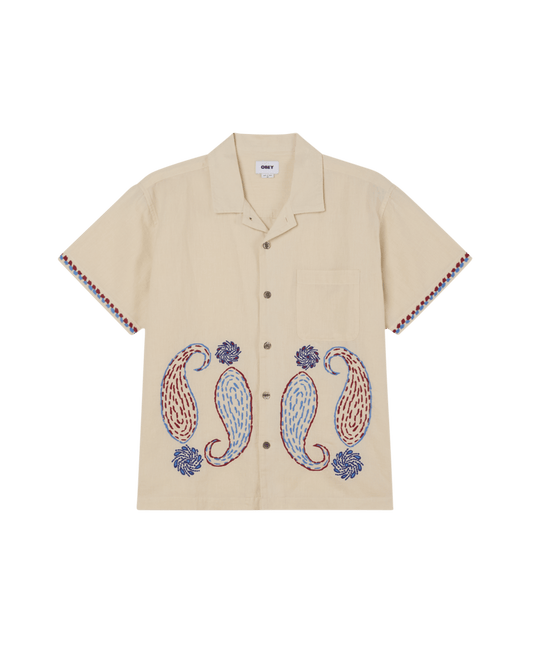 La camicia OBEY Quentin a maniche corte è realizzata in misto cotone e lino ed è caratterizzata da originali grafiche ricamate nella parte frontale e sulle maniche, taschino sul petto e bottoni frontali.