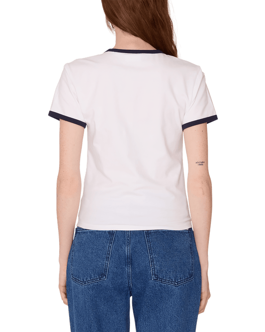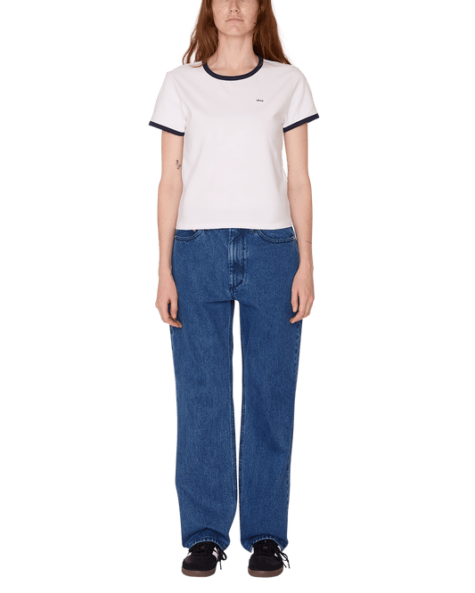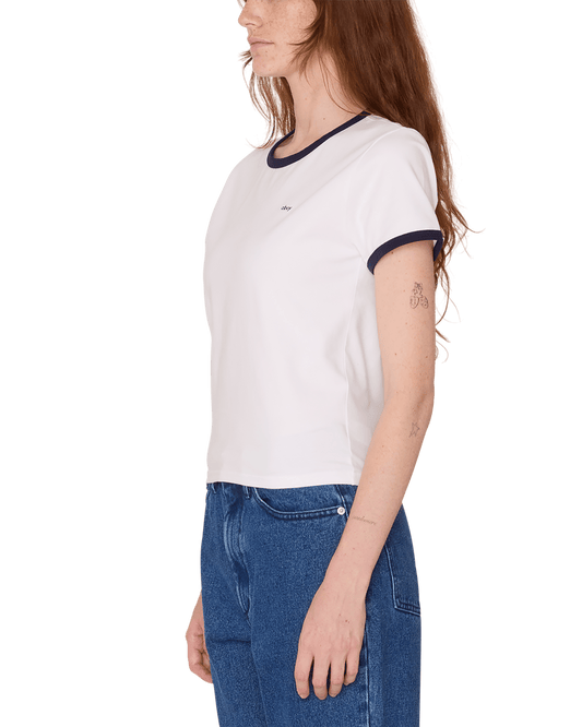 Questa t-shirt OBEY a maniche corte da donna presenta una vestibilità aderente ed è certificata Fair Trade. Presenta bordi a costine a contrasto e logo ricamato sul petto.