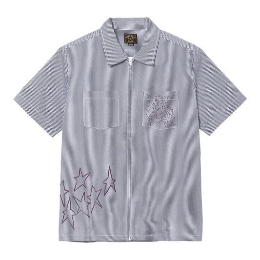 Questa camicia Dark Seas a maniche corte è realizzata in morbido cotone ed è caratterizzata da grafiche personalizzate ricamate nella parte frontale, tasche sul petto e chiusura con zip.