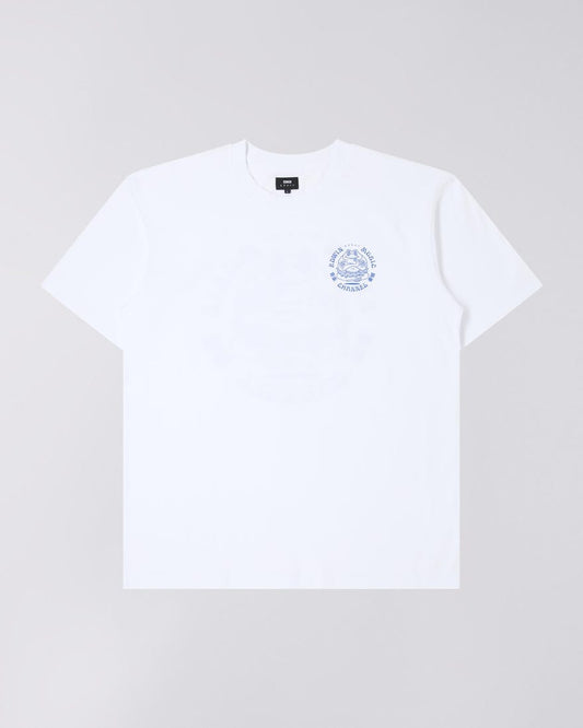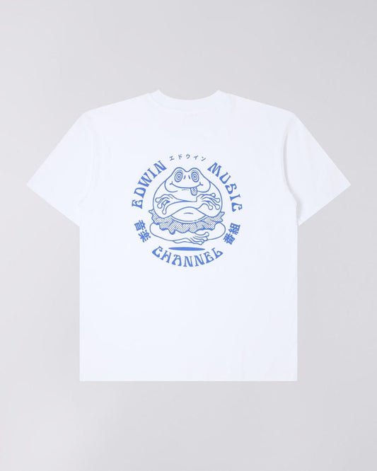 La t-shirt a maniche corte EDWIN Music Channel è realizzata in morbido cotone e presenta una grafica personalizzata stampata sul petto e sulla schiena. Il modello è alto 185 cm e indossa la taglia L.