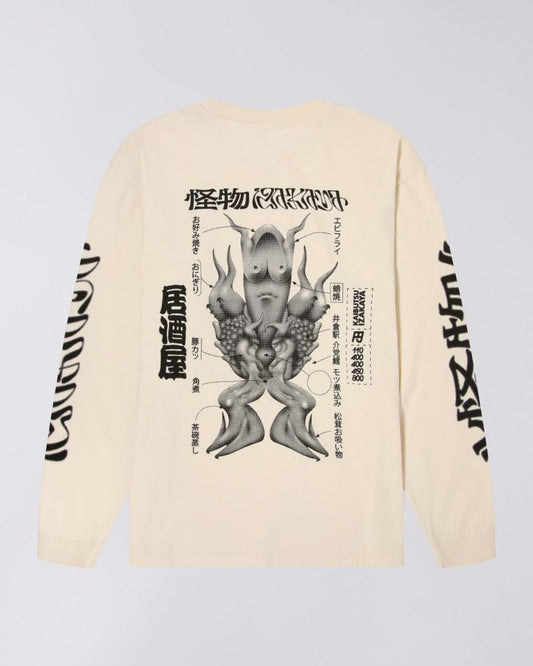 La T-shirt EDWIN Kaibutsu Izakaya è una maglietta oversize a maniche lunghe realizzata in morbido cotone con bordi a costine e grafica personalizzata stampata nella parte frontale, sulle maniche e sulla schiena. Questa t-shirt rende omaggio al mondo della cucina giapponese e al suo fascino irresistibile.