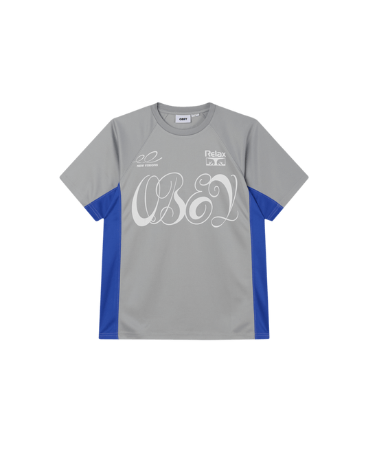 La maglia OBEY Plaza a maniche corte è realizzata in tessuto tecnico e presenta una grafica personalizzata stampata sul petto e sulla schiena.