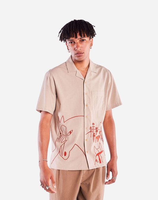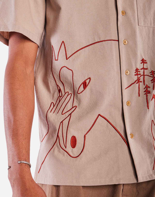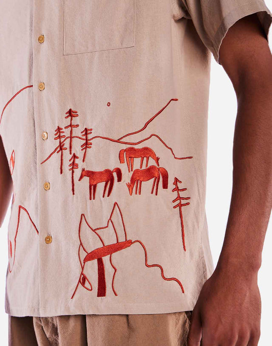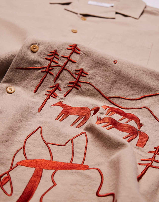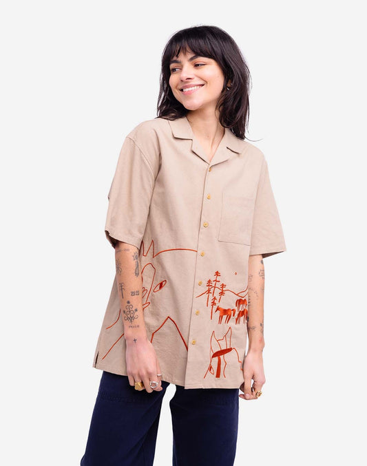 La camicia Olow Aloha Hestur a maniche corte è realizzata in morbido e fresco cotone organico e presenta una chiusura frontale con bottoni e grafiche personalizzate ricamate all-over.