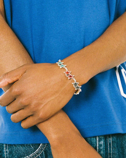 Bracciale Twojeys caratterizzato da 6 loghi bifacciali smaltati su ottone, con catena che corre lungo tutta la lunghezza e chiusura con gancetto.