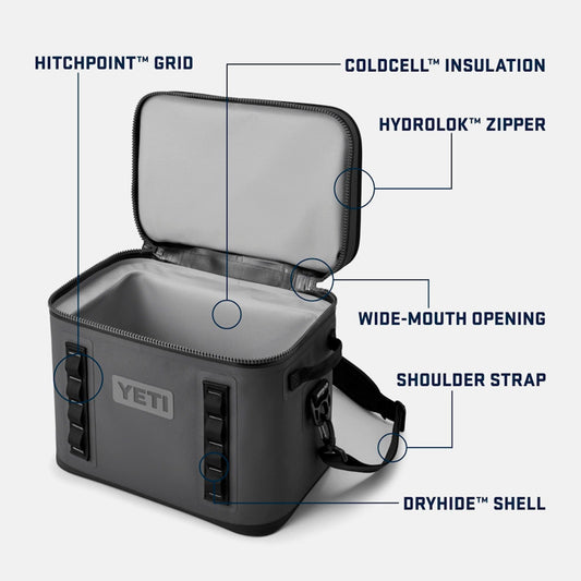 Il weekend chiama, quindi prepara il tuo YETI® Hopper Flip® 18 e parti per la prossima avventura. La borsa termica YETI® più grande si adatta al trasporto di quantità maggiori di cibo e bevande e alle spedizioni in gruppo più lunghe. Hopper Flip® 18 è resistente, a tenuta stagna e versatile grazie alla griglia HitchPoint™ frontale che offre una base per attaccare con facilità qualsiasi accessorio. Come per tutti i Coolers YETI®, l’esclusiva tecnologia di isolamento termico consente di trasportare facilmente le tue scorte per giorni.