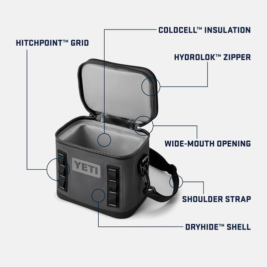 Uno dei piaceri delle uscite fuori porta è viaggiare leggeri. La borsa termica YETI® Hopper Flip® 8 è perfetta per mantenere cibi e bevande al fresco mentre sei in movimento. Le pratiche dimensioni, la zip 100% tenuta stagna e l’esclusiva tecnologia di isolamento termico consentono di trasportare facilmente le tue scorte dall’alba al tramonto. Il tessuto esterno è completamente impermeabile e resistente a forature, abrasioni e raggi UV. La griglia HitchPoint™ frontale ti offre una base per attaccare con facilità qualsiasi accessorio, offrendo la massima flessibilità negli spostamenti.